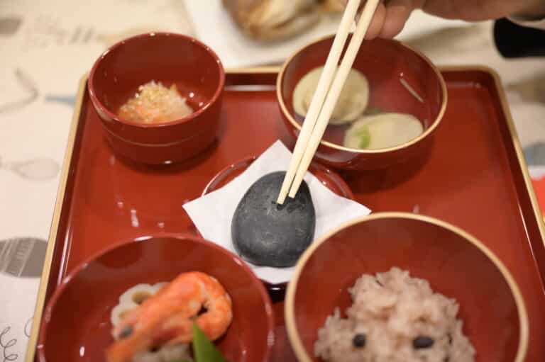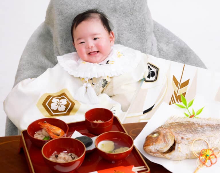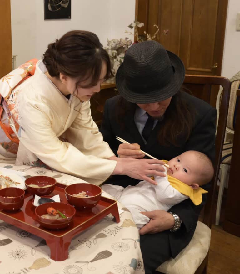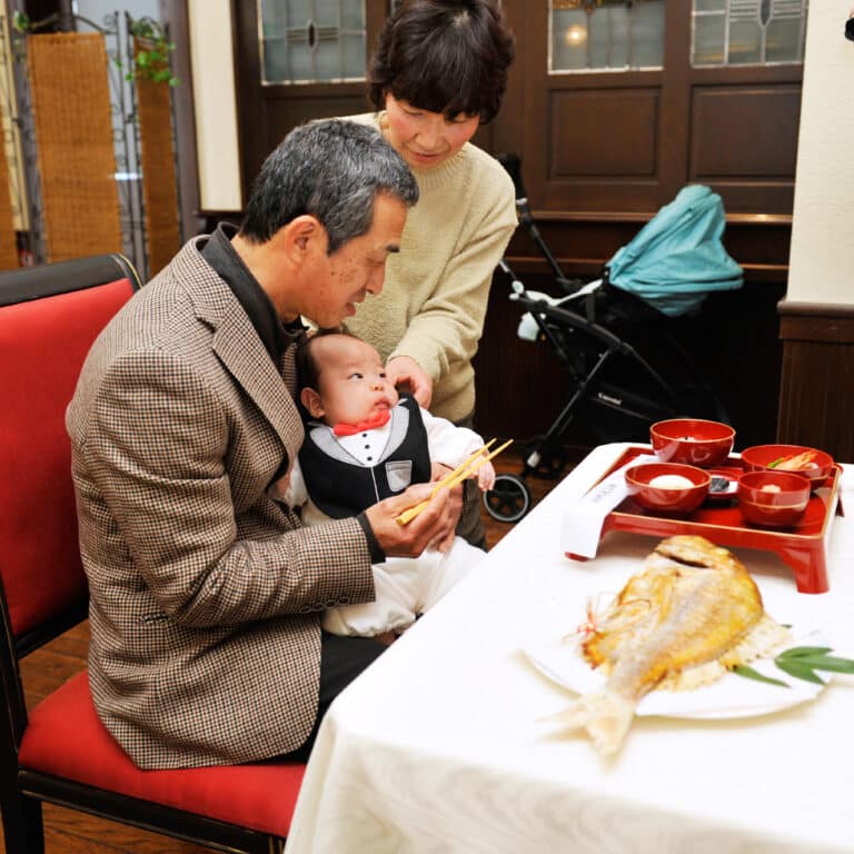 お子様の為に、赤飯、尾頭付きの焼き魚、歯固めの小石、御汁を用意し食べるまねごとを、ご家族みんなが見守る中で行います。お子様が食べ物に一生困らないようにという願いを込めて行う内祝いです。